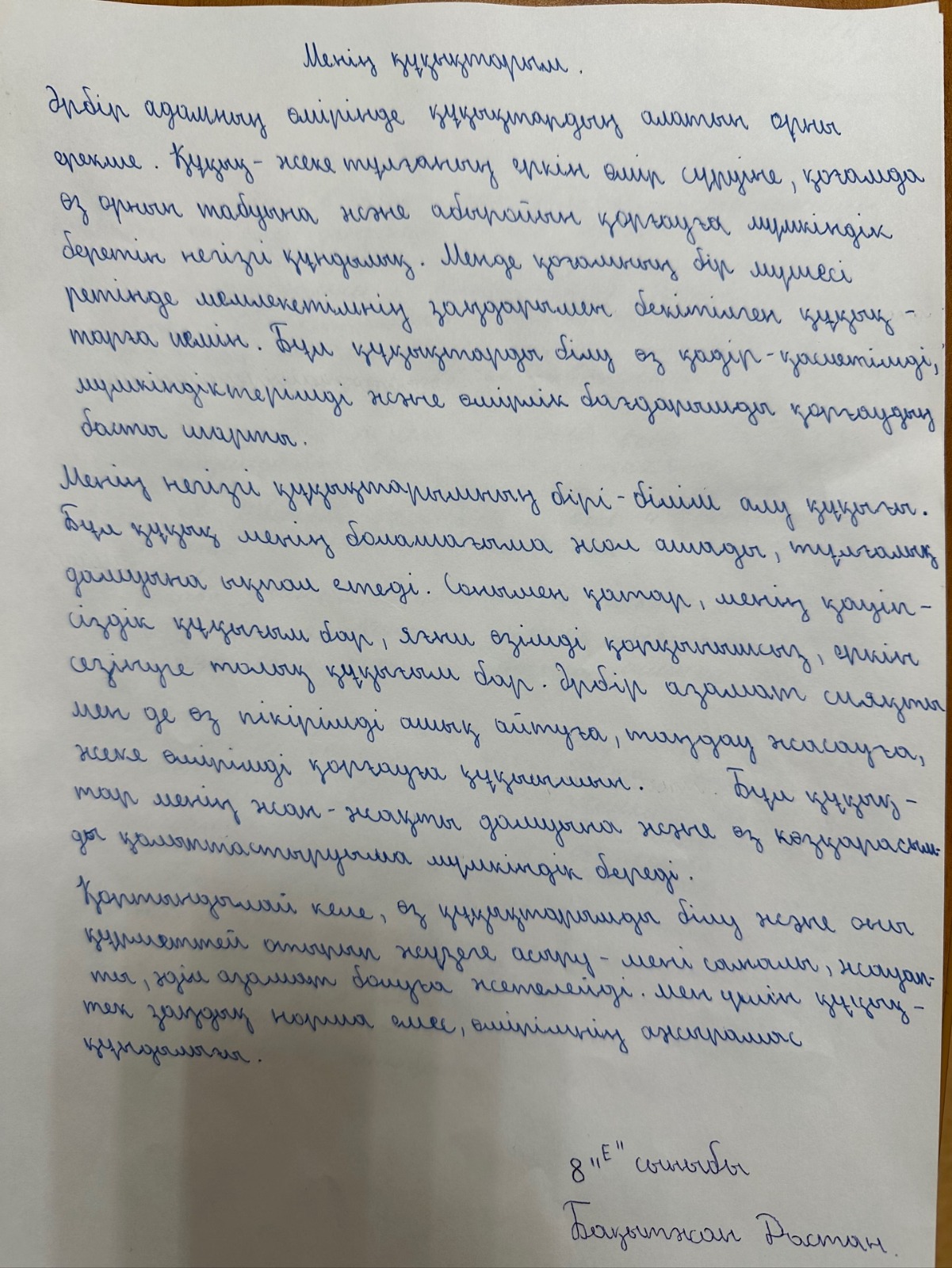 24.11.2025 Менің құқықтарым» тақырыбындағы эссе байқауы өз мәресіне жетті. Оқушылар адам құқықтары, еркіндік және жауапкершілік туралы терең ойларымен бөлісті.