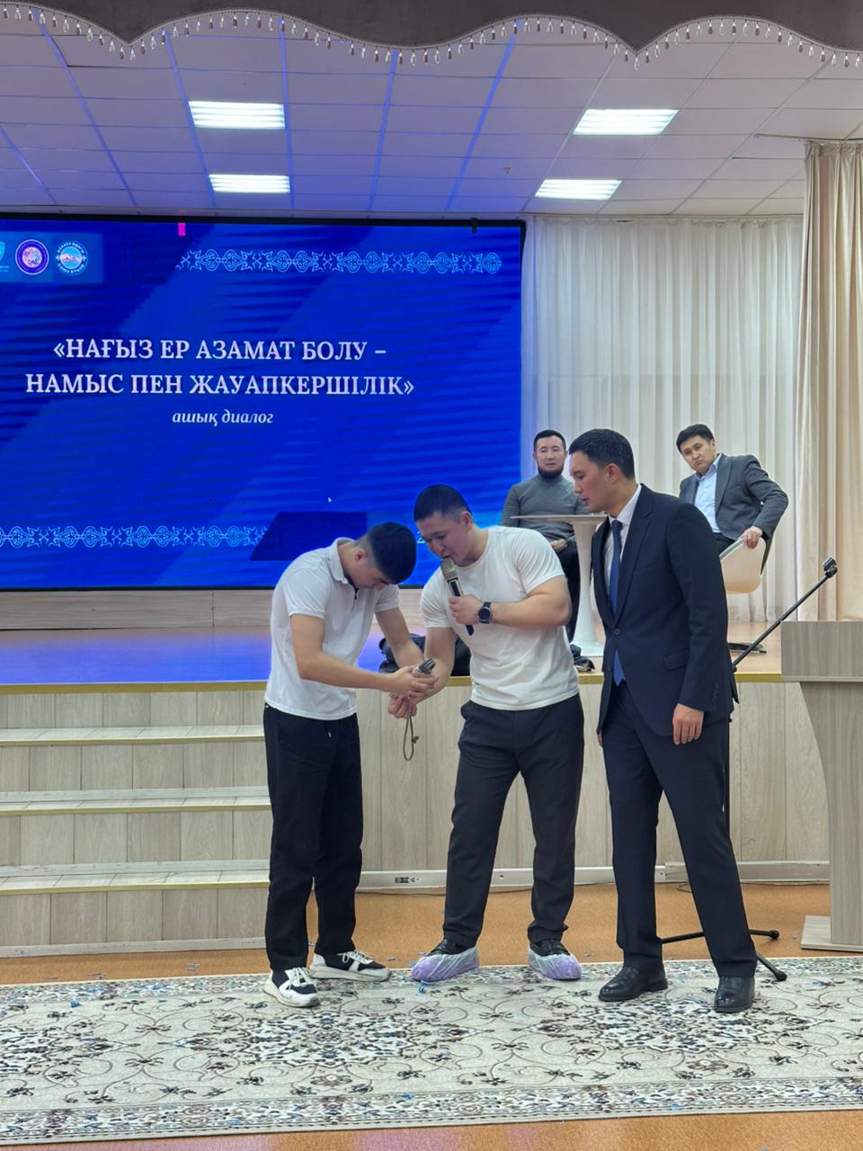 "Заң мен тәртіп" айлығы аясында №72 мектеп-лицейде 21.01.2026ж «НАҒЫЗ ЕР АЗАМАТ БОЛУ – НАМЫС ПЕН ЖАУАПКЕРШІЛІК» тақырыбында ашық диалог алаңы өткізілді. Іс-шараға “Балаларға қосымша білім беру оқу- әдістемелік орталығы” КММ әдіскері Айнур Амангелдиевна, Темірден түйін түйген спортшы, Қазақстанның гір көтеруден чемпионы Шәріпбекұлы Қуаныш, Астана қаласы Дін істері басқармасының дінтанушы маманы Қуатов Арулан Қуанышұлы, №72 мектеп-лицейінің Әкелер кеңесінің төрағасы Қожахметов Шыңғысхан Шопанұлы, мектептің Әкелер кеңесінің белсенді мүшелері Айдаров Сәндібек Амангелдіұлы, Бегасилов Рахат Әбсейітұлы, Дөкесов Асылбек Куандықұлы қатысты. Іс-шара өте жоғары деңгейте өтілді, Әкелер әртүрлі тақырыптағы өзекті мәселелерді көтеріп, шешімін оқушылармен бірге талқылай отырып ашық алаңды қызықты әрі пайдалы өткізе білді. Мектеп директоры А.Ж. Дюсенова келген қонақтар мен мектептің Әкелер кеңесіне алғысын білдіріп, балалармен бірге мұндай іс-шараларды бірге жалғастыру туралы ұсынын білдірді.