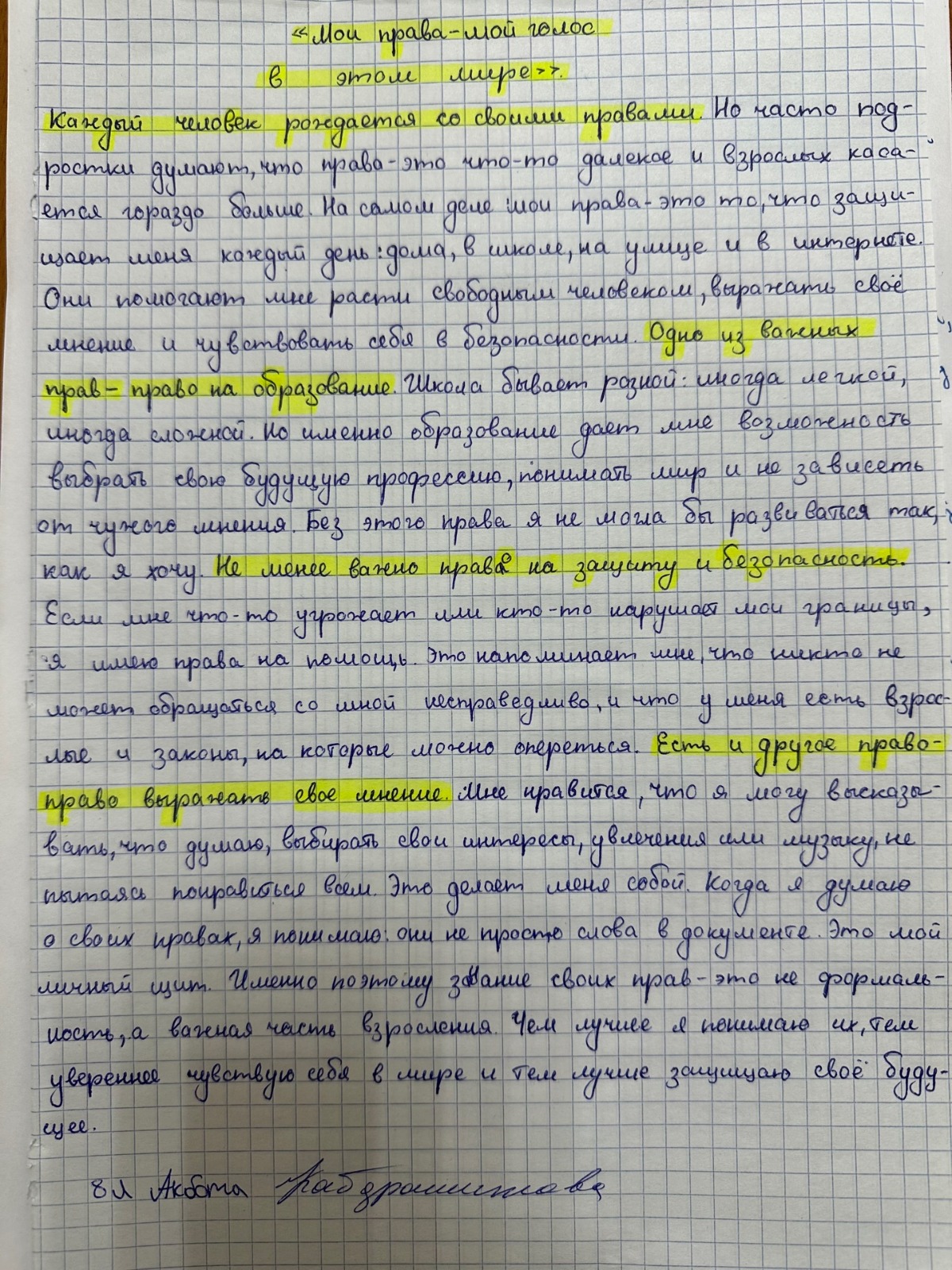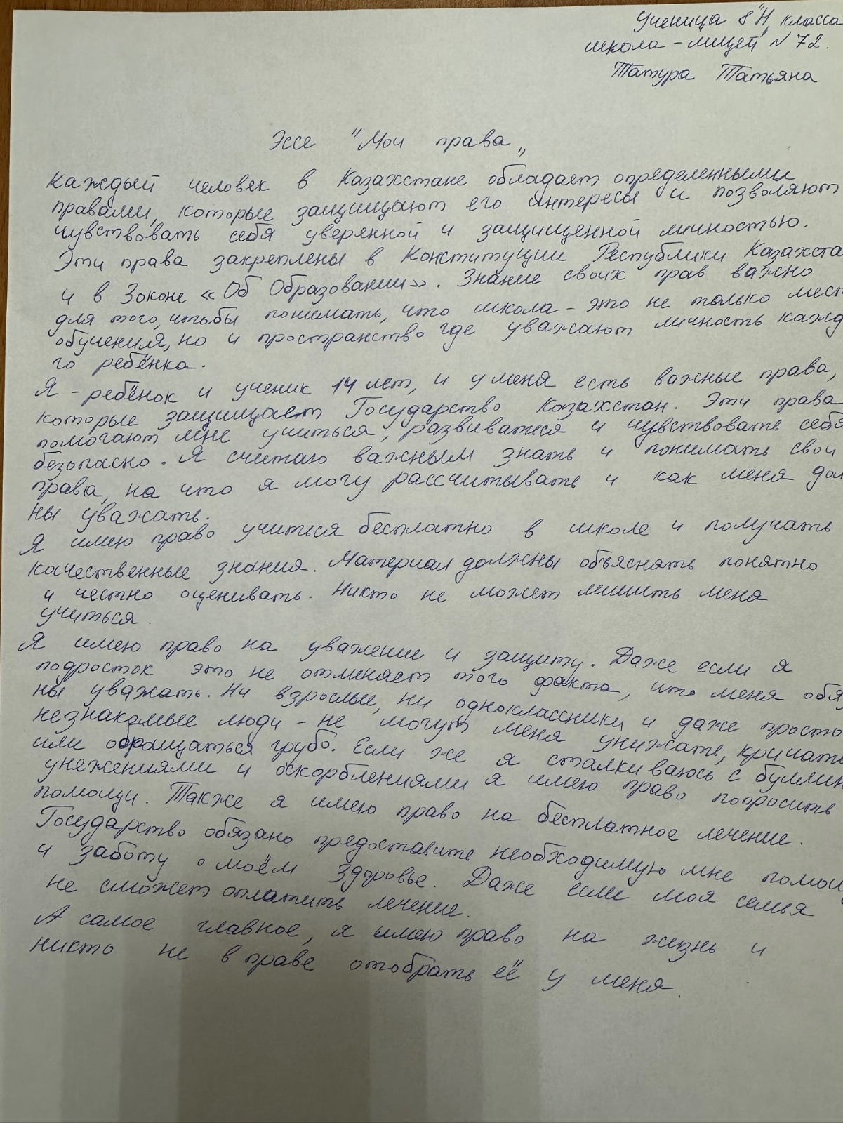 24.11.2025 Менің құқықтарым» тақырыбындағы эссе байқауы өз мәресіне жетті. Оқушылар адам құқықтары, еркіндік және жауапкершілік туралы терең ойларымен бөлісті.